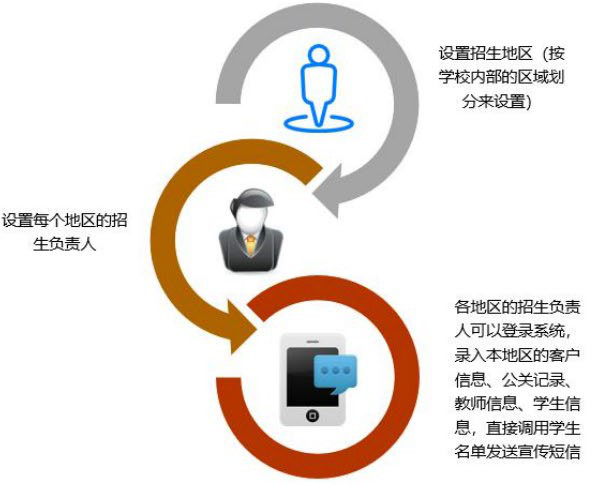 智慧校園招生管理系統(tǒng)針對招生部門,整合系統(tǒng)涵蓋了整個校園招生流程, 招生計劃制定、招生計劃安排、招生宣傳部署、錄取信息采集、公關記錄、學生信息、錄取管理以及畢業(yè)證書的打印、郵寄等一體化的招生信息化管理。通過招生系統(tǒng)使得學校獲得更多的學生生源,通過招生系統(tǒng)讓學生快速的接觸學校,架起一座通通往學校的一座橋梁。 二、系統(tǒng)架構(一)招生地區(qū)設置:可設置招生地區(qū)根據(jù)學校內(nèi)部按照區(qū)域劃分設置,并且可給這個地區(qū)設置招生負責人,招生負責人可登錄系統(tǒng)錄取當?shù)氐目蛻粜畔ⅲP信息,招生學生信息。 ![]()