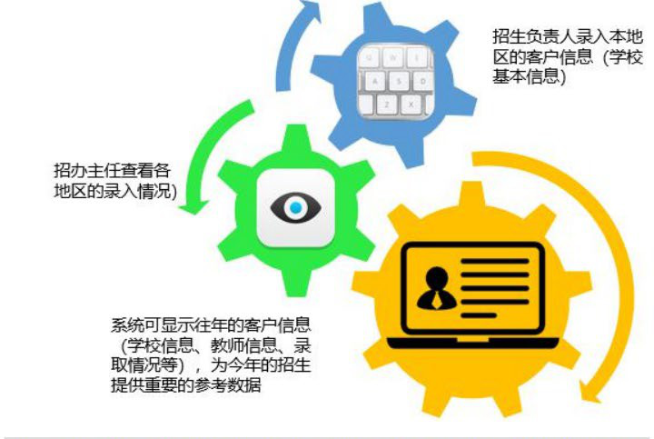 每個地區(qū)招生負責人錄入本地區(qū)的客戶信息以及學校的基本信息,招生辦主任可通過系統(tǒng)查看各地區(qū)招生錄入情況,系統(tǒng)可顯示往年客戶信息,招生信息,錄取信息,為今年招生錄取提供參數(shù)。 ![]()