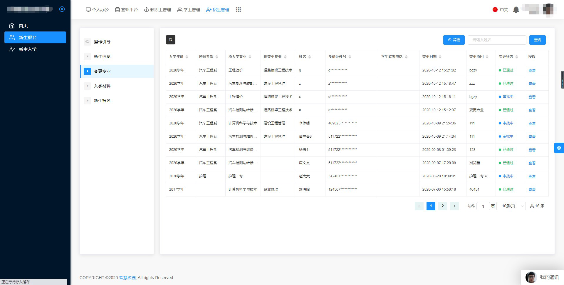 學生可在網(wǎng)上報名填寫個人信息,可由當?shù)卣猩k老師登記學生信息進入系統(tǒng);網(wǎng)上填報學生信息,系統(tǒng)根據(jù)填報的信息分配各個招生老師跟進。領導可查看信息錄入情況。 ![]()